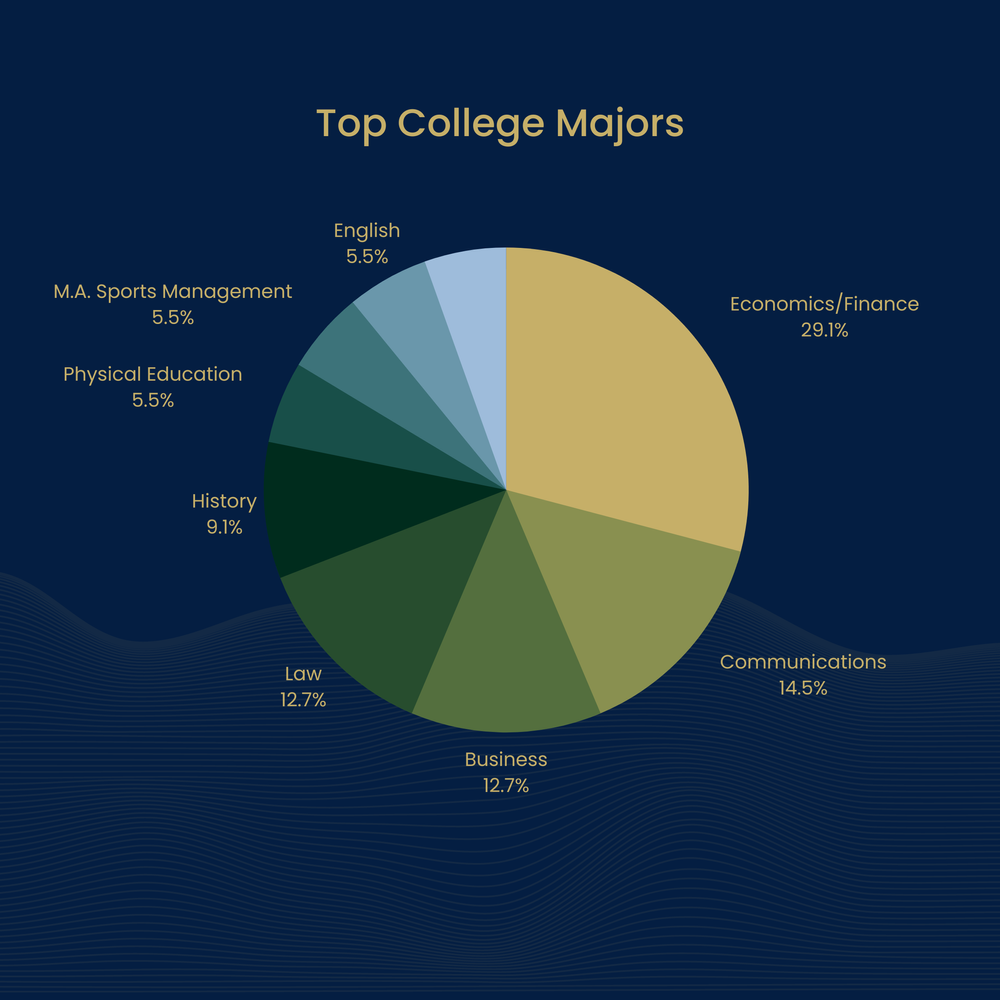 Once again, there is no set path. Close to 30% majored in economics or finance. This might seem strange for a career in sports, but the biggest trend of the past 30 years has been the integration of advanced statistics and mathematics into every facet of a sports organization. The ability to understand numbers and manipulate data is a vital asset to anyone with aspiring front-office ambitions.